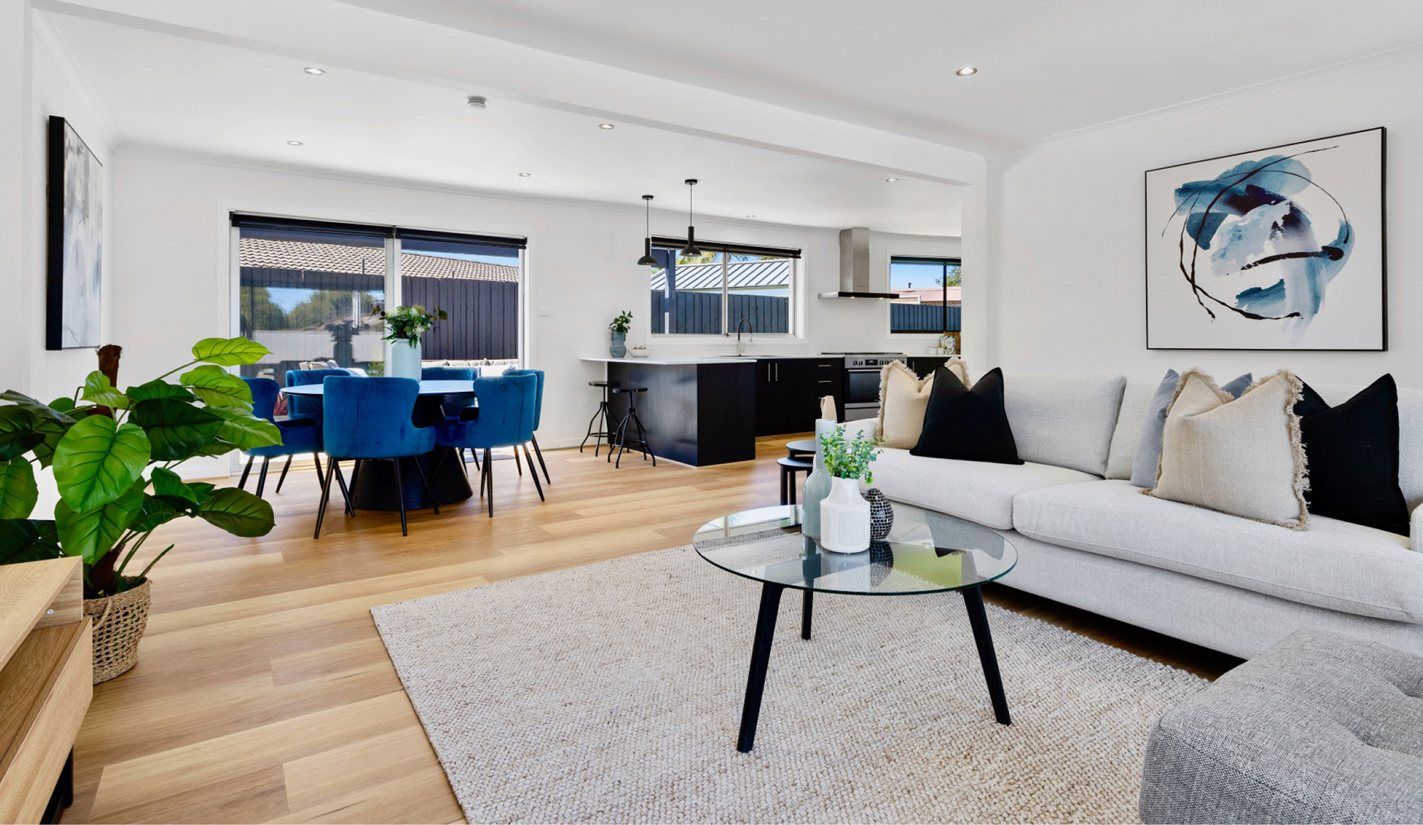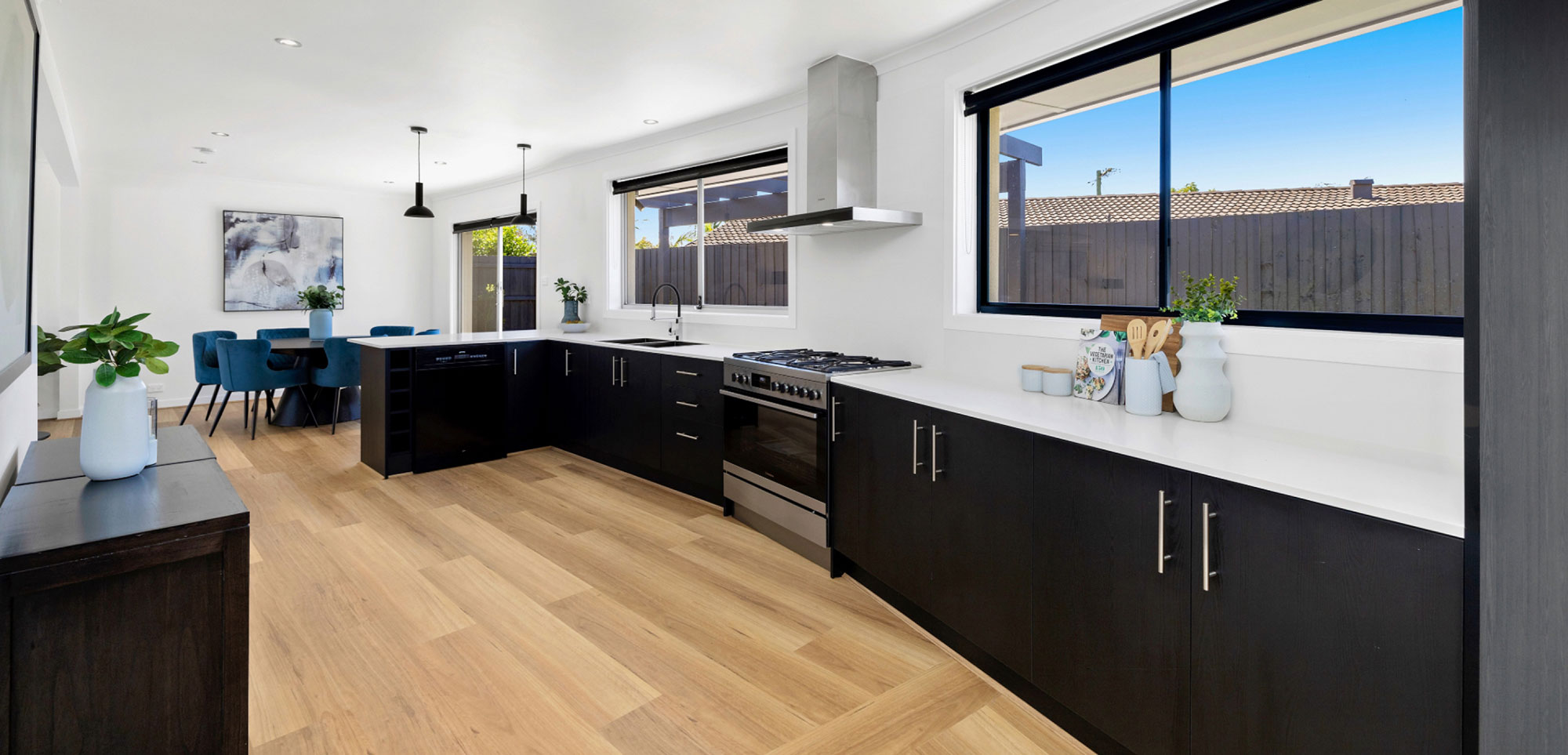 This project's interiors have been impressively designed for modern-day living. Featuring timber flooring, open-plan living areas that promote cooling cross breezes, and two alfresco-style entertaining areas perfect for summer.
