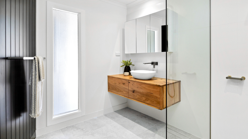 Designer ensuite with floating timber vanity, a stylish space illuminated in natural light where exquisite gunmetal fixtures, genuine stone basins and premium underfloor heating are highlights.
