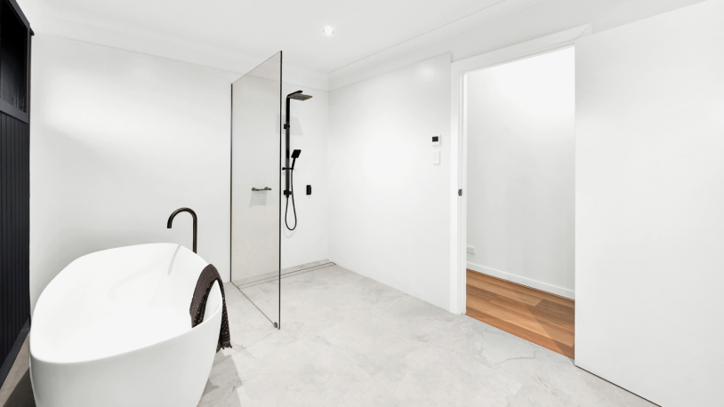 This magazine-worthy bathroom is illuminated in natural light. It features a freestanding bath, floating timber vanity, exquisite Phoenix tapware, genuine stone basins, and premium underfloor heating.